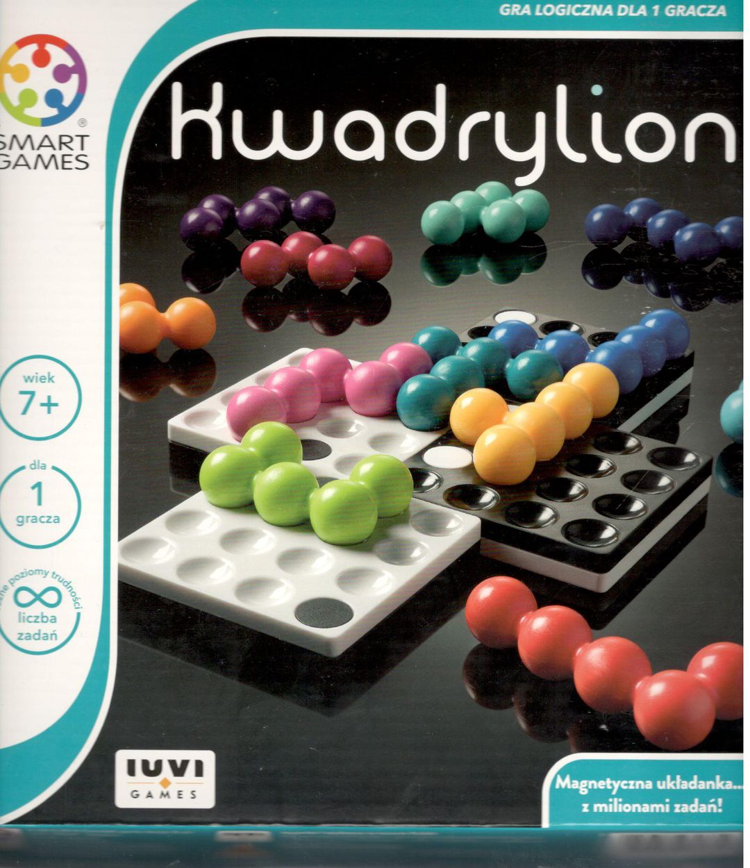 Kwadrylion to magnetyczna gra logiczna, gdzie korzystając z przygotowanych, lub tworząc własne warianty plansz, gracz rozwija przestrzenne i logiczne myślenie! Przygotuj plansze i umieść na niej 12 elementów to takie proste! Ale czy na pewno? Przekonaj się grając samodzielnie lub z dzieckiem. Nauka przez zabawę, to wspólna cecha wszystkich Smartów! Poznaj je już dziś! Za co Twoje dziecko tę grę? Zagrasz w nią gdzie tylko zechcesz! Można tworzyć własne warianty plansz. Rozwija wyobraźnię. (rebel.pl)